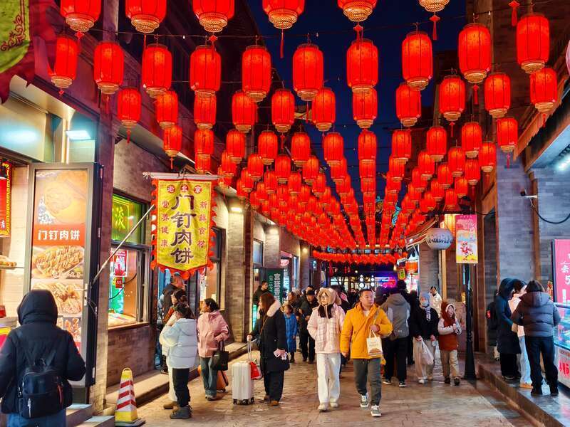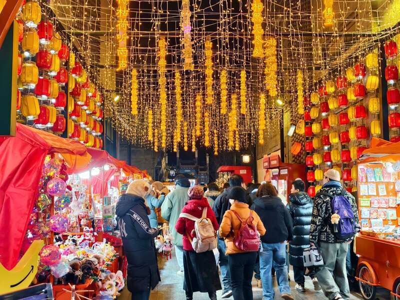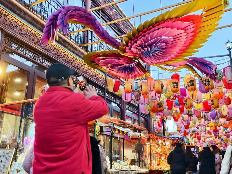 来自河北的游客刘女士和家人专程前来打卡,在鲜鱼口胡同的灯笼前频频拍照。“太有氛围了!花灯映着古建筑,拍出来的照片特别好看。”虽然提前做了攻略,但她还是难掩兴奋:“没想到北京的年味儿这么早就浓起来了,逛一趟特别值!”