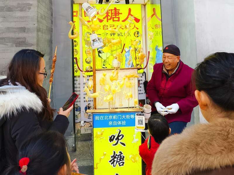 市民程先生举着手机记录下孩子体验吹糖人的过程,他说:“带娃来逛花灯、吹糖人,既能让孩子玩得开心,又能感受老北京的民俗,比在家待着有意思多了。”