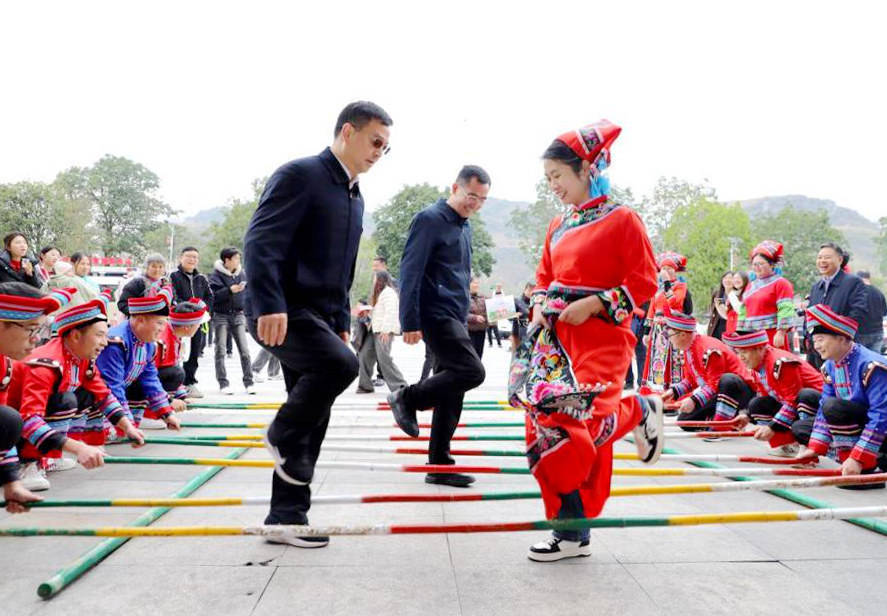 旅客参与跳竹竿舞。