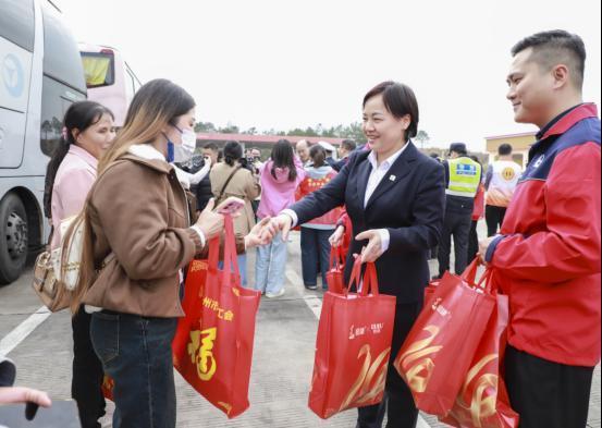 党员志愿者给返乡人员送福袋。中石化广西公司供图